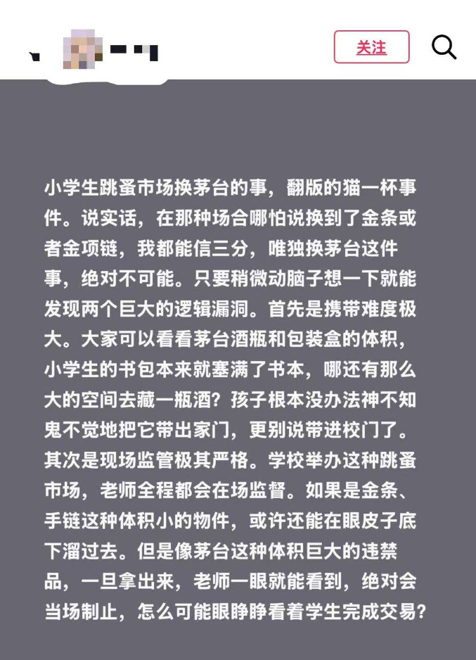 视频发出后,引发了网友的热议。有网友认为小女孩的置换非常划算,“很有眼光”。也有网友质疑,“跳蚤市场的置换物通常都会有家长一起准备,家长怎么会不知道孩子带了茅台酒呢?”“如果是金条、手链这类体积小的物件,或许还能在眼皮下溜过去,但是像茅台这种体积大的违禁品,老师一眼就能看到。”