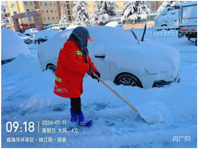 1月11日,环卫工正在清扫威海一小区的积雪(央广网发 威海西海环卫 供图 )