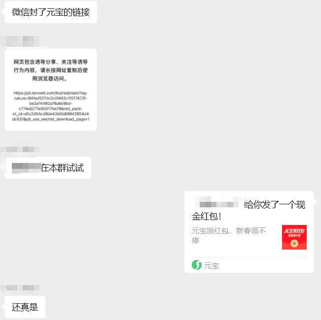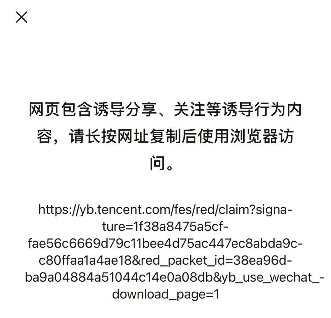 据中新经纬报道,10点左右记者实测发现,点开元宝红包链接后,页面显示“网页包含诱导分享、关注等诱导行为内容,”需要复制网址到浏览器打开。