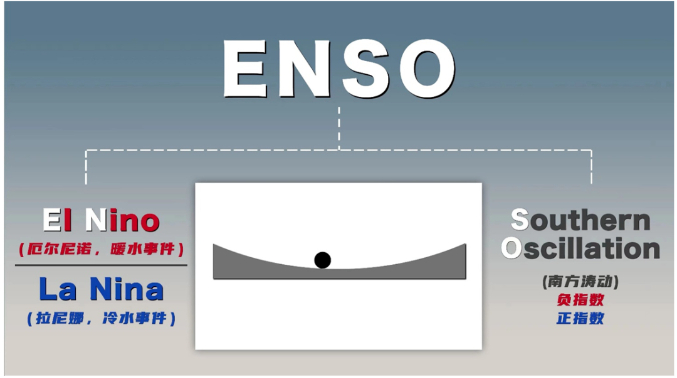 厄尔尼诺-南方涛动(ENSO)是发生在热带太平洋、具有3-7年周期的海气耦合振荡现象,是气候系统的自然变率。一般利用热带中东太平洋固定区域海表温度(SST)异常值(即偏离气候平均态的程度)持续的时间和强度来表示ENSO的位相。如果3个月滑动平均SST值持续5个月大于0.5°C,则为暖位相,称为厄尔尼诺;如果持续5个月小于-0.5°C,则为冷位相,称为拉尼娜;如果在-0.5°C至0.5°C之间变化,称为中性状态。