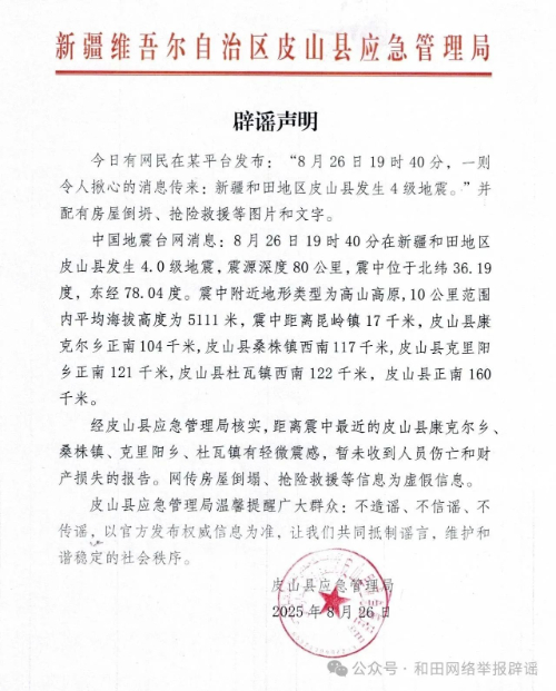 据中国地震台网正式测定,8月26日19时40分,新疆和田地区皮山县发生4.0级地震,震源深度80公里。某平台有网民为博取流量,故意配发房屋倒塌、应急救援等图片误导公众。