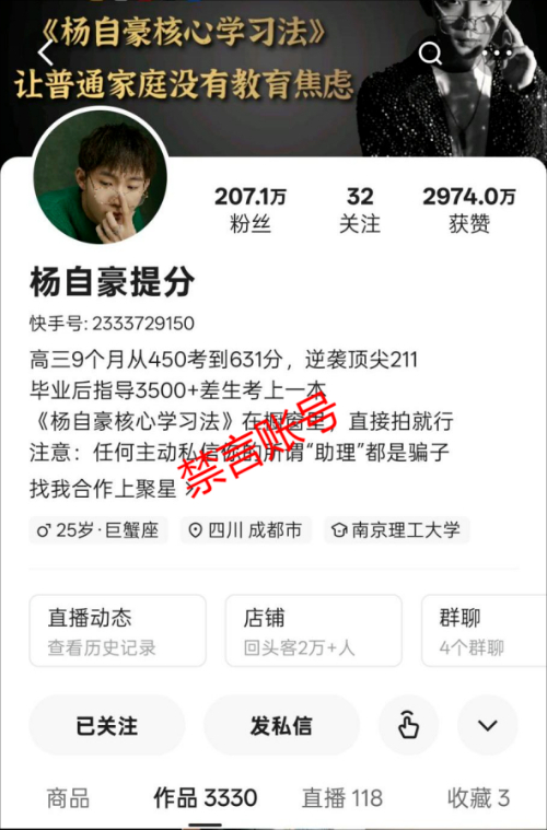 1.抖音账号“杨自豪提分”、快手账号“杨自豪提分”、小红书账号“杨自豪提分咨询”在教育领域“贩卖”焦虑带货卖课,造成恶劣影响。涉及的账号已依法依约处置。